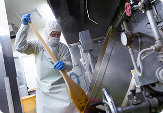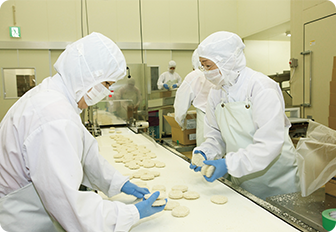 安心して口にできる製品は、作り手の衛生管理に対する真心にゆだねられています。当社の衛生管理システムを原材料受入れから各工程、最終製品に至るまで遵守。お客様の信頼に応える製品造りを日々続けております。