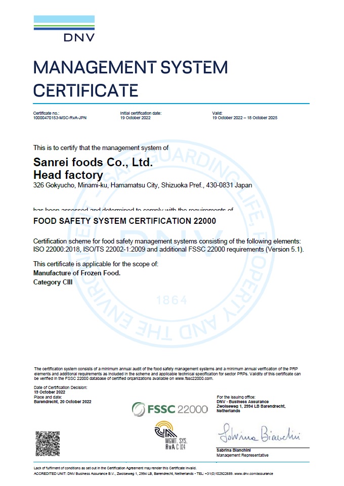 食品安全システム認証 FSSC22000 取得